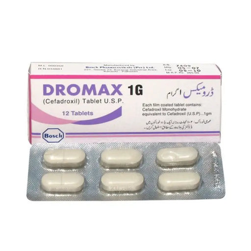 BOSCH PHARMACEUTICALS (PVT) LTD.Dromax tablet contains Cefadroxil | belongs to Cephalosporin How it works Dromax tablet 1 gm 2×6’s works by interfering with certain processes tha...
