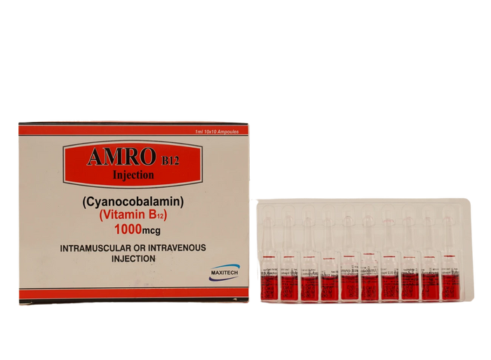 AMRO B12 Injection is a high-quality Vitamin B12 supplement, formulated to provide your body with the essential nutrients it needs to maintain energy levels and support overall health. Each box contains 100 vials of B12 injections, offering a convenient and effective way to address vitamin B12 deficiency.